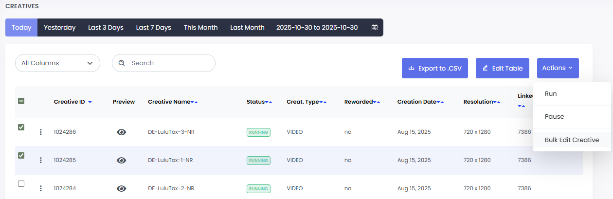 Bulk editing creatives saves valuable time and reduces the risk of manual errors. Instead of editing each creative one by one, users can now make uniform updates instantly - ensuring consistency across campaigns and minimising discrepancies in tracking and reporting. This feature allows you to edit