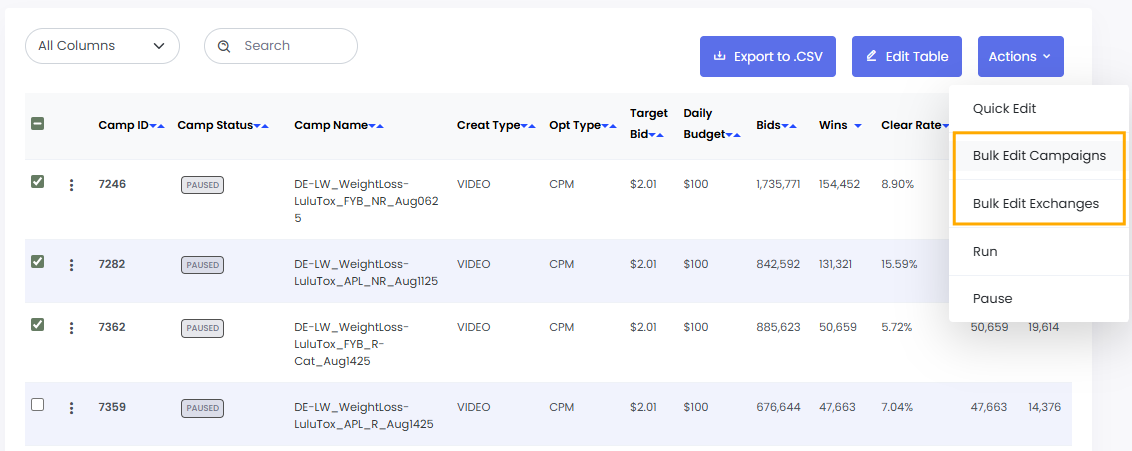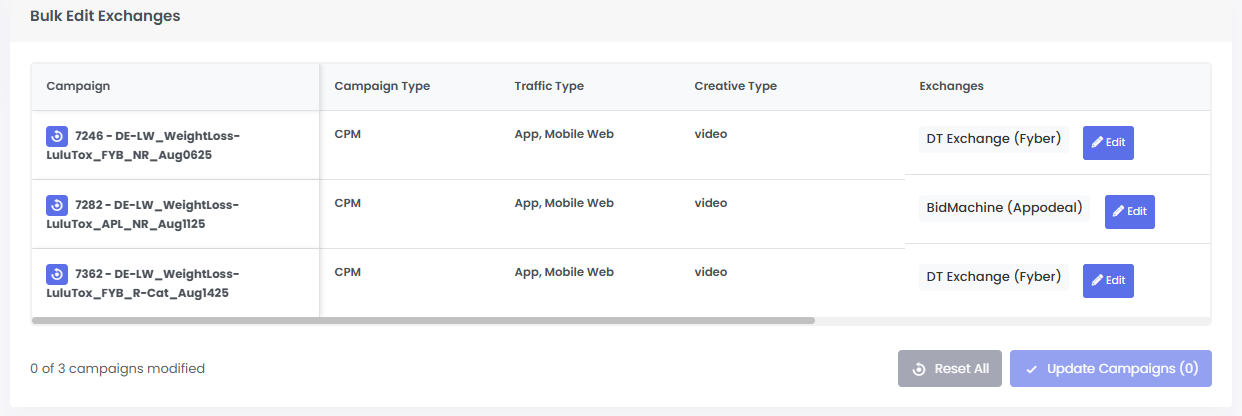 Click on either Bulk Edit Campaigns or Bulk Edit Exchanges
