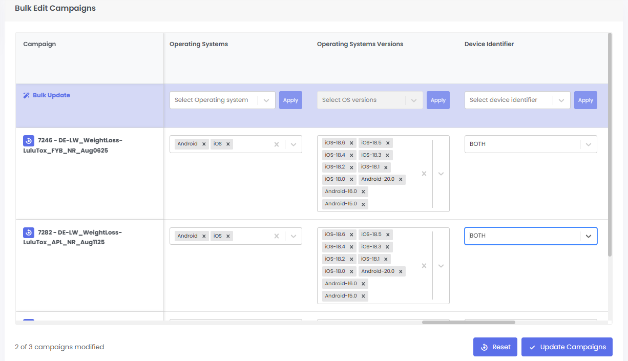 OS & OS Versions: Target specific operating systems or OS versions across multiple campaigns.
