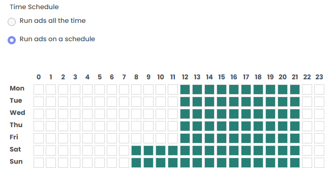 The default option is Run ads all the time, which means that the campaign will run 24/7. However, if you plan to run within a specific time frame, select Run ads on a schedule instead.
