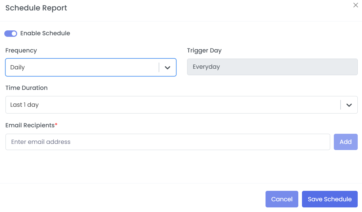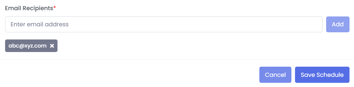 Include the email address(es) in the Email Recipients list and click the Add button. Once this is done, click Save Schedule.
