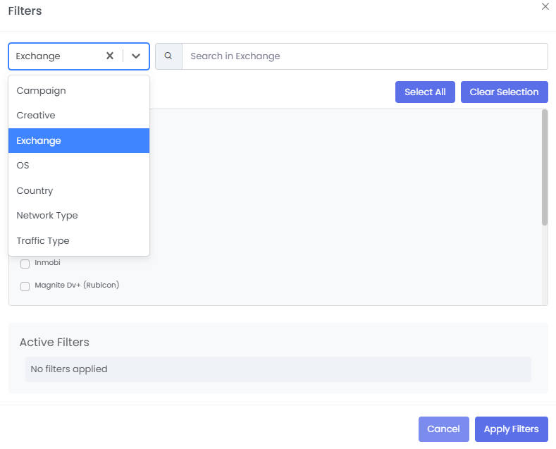 Explore performance your way: Break down results by Campaign, Creative, Exchange, OS, Country, Network Type, and Traffic Type.